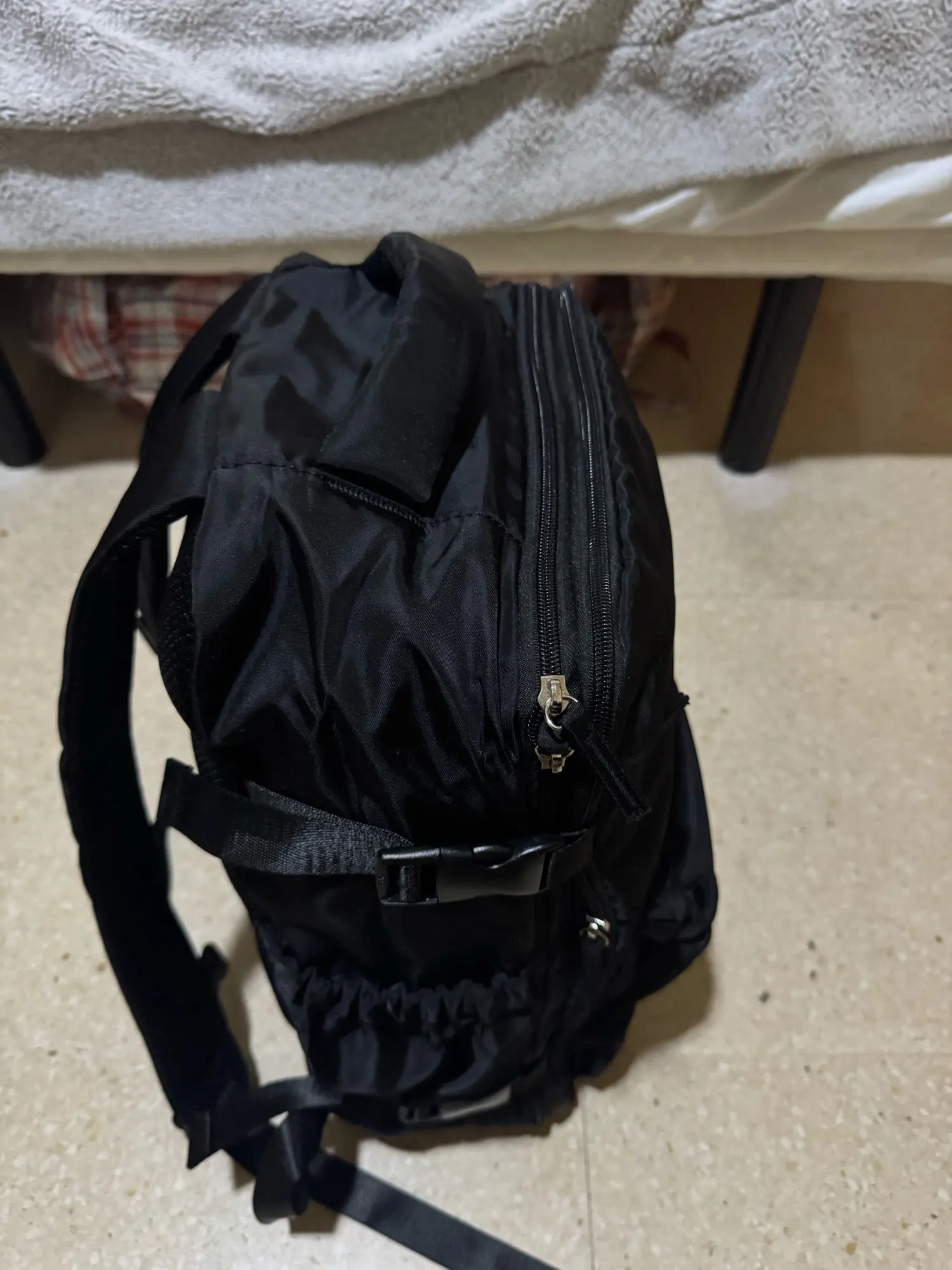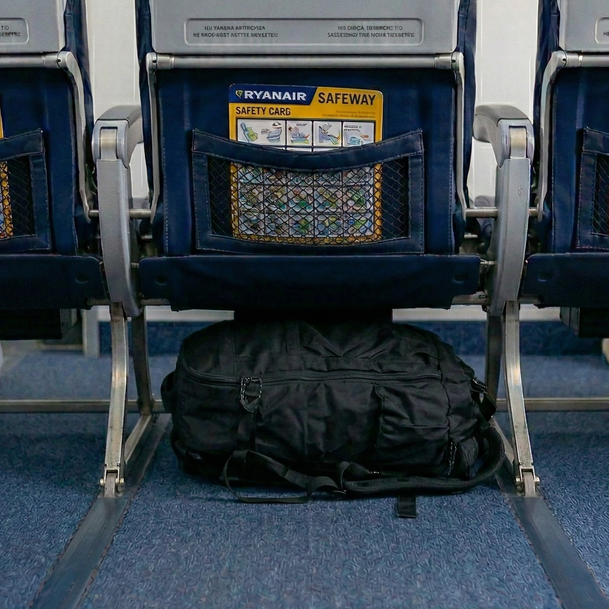 Der klassische Ryanair-Moment: Den Rucksack unter dem Vordersitz verstauen, bereit für den nächsten Trip. Alles ist gepackt, um die Handgepäckregeln zu meistern.