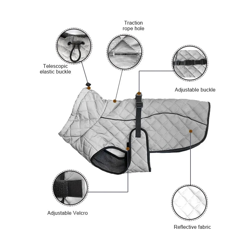 Dieser Mantel ist mehr als nur Kälteschutz – er ist ein Upgrade für jeden Herbstspaziergang. Das markante Waben-Stepp-Design sorgt für eine optimale Wärmeisolierung, ohne den Hund zu beschweren. Dank des extra hohen Kragens bleibt auch der empfindliche Halsbereich vor kaltem Wind geschützt. Der ergonomische Schnitt mit weiten Beinausschnitten garantiert, dass dein Hund rennen, springen und spielen kann, als hätte er nichts an. Robust, wasserabweisend und stilvoll in Khaki und Grau.